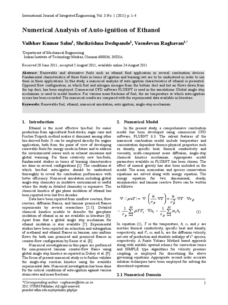 Numerical Analysis Of Auto Ignition Of Ethanol Vaibhav Kumar Sahu Shrikrishna Deshpande Vasudevan Raghavan Fluid Dynamics Combustion