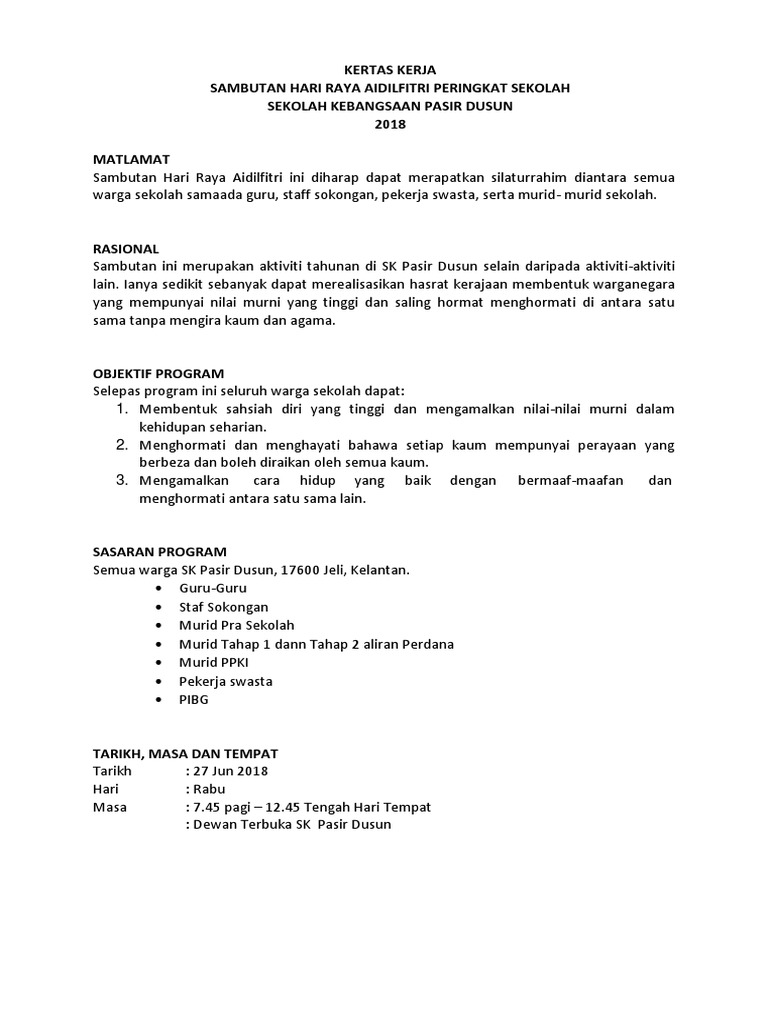Doc Kertas Kerja Program Sambutan Hari Raya Aidilfitri Peringkat Sekolah Kebangsaan Kampung Busut Baru Zaifi Ras Academia Edu