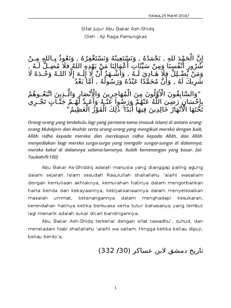Meneladani Sifat Jujur Abu Bakar Ashidiq