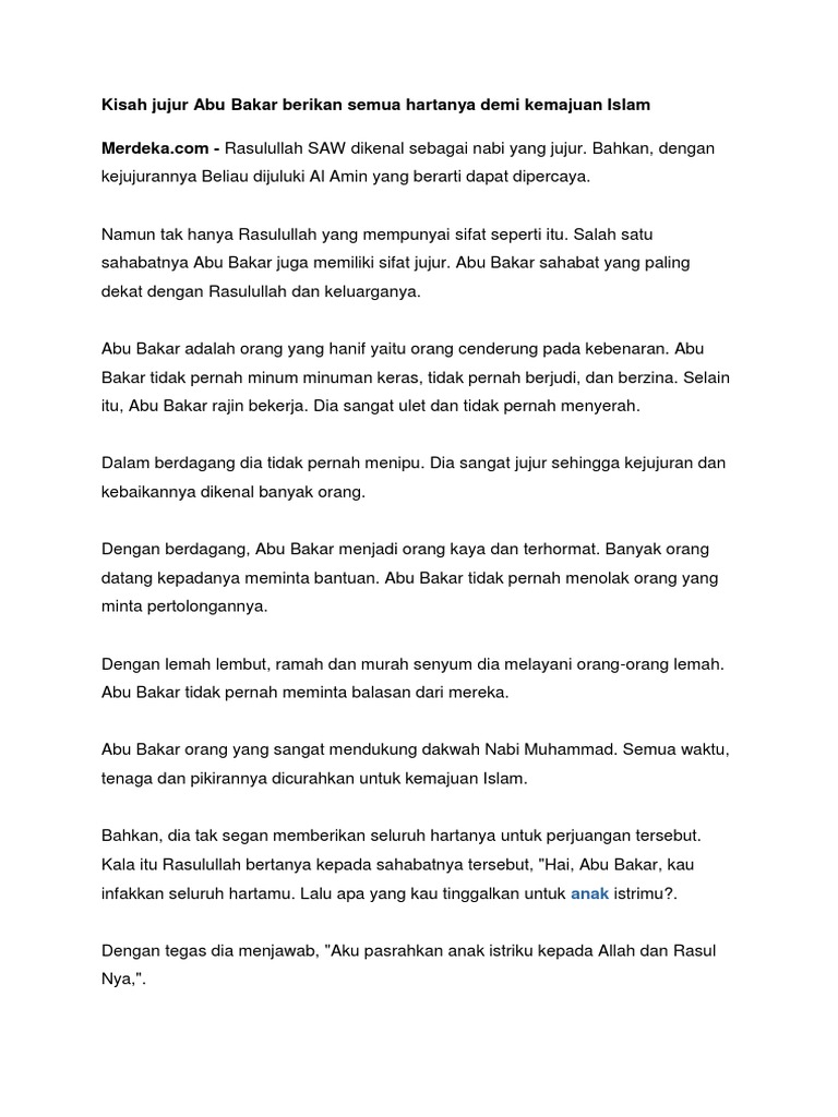 Kisah Kejujuran Abu Bakar As Siddiq Singkat