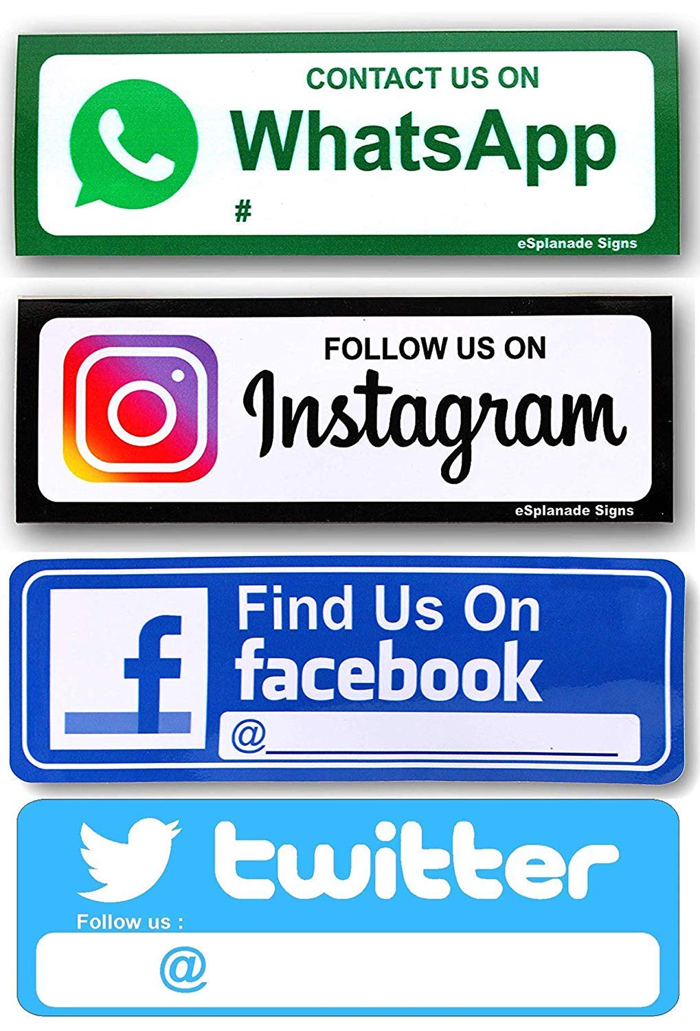 Esplanade Find Us On Facebook Twitter And Instagram Whatsapp Sign Sticker Decal Combo Set Of 4 Easy To Mount Weather Resistant Long Lasting Ink Size 9 X 3 Amazon In Office Products