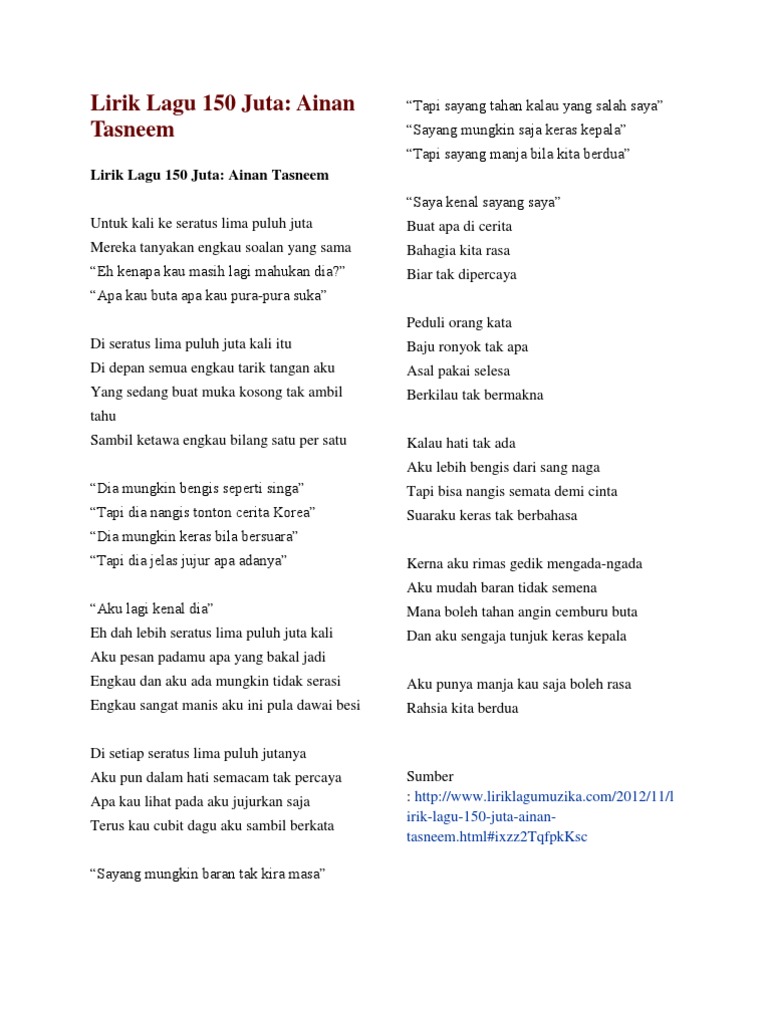 Kumpul Lirik Best Lirik Lagu 150 Juta Ainan Tasneem