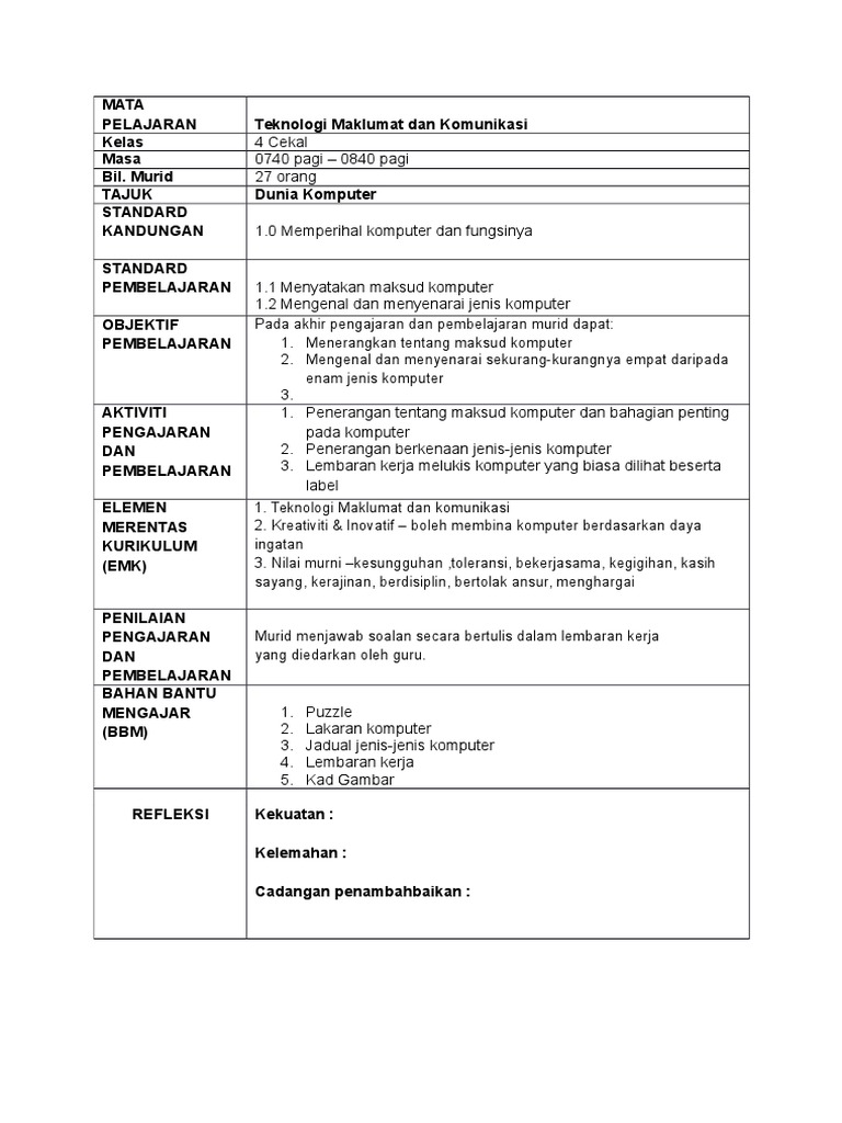 Contoh Rancangan Pengajaran Harian Teknologi Maklumat Dan Komunikasi Tahun 4